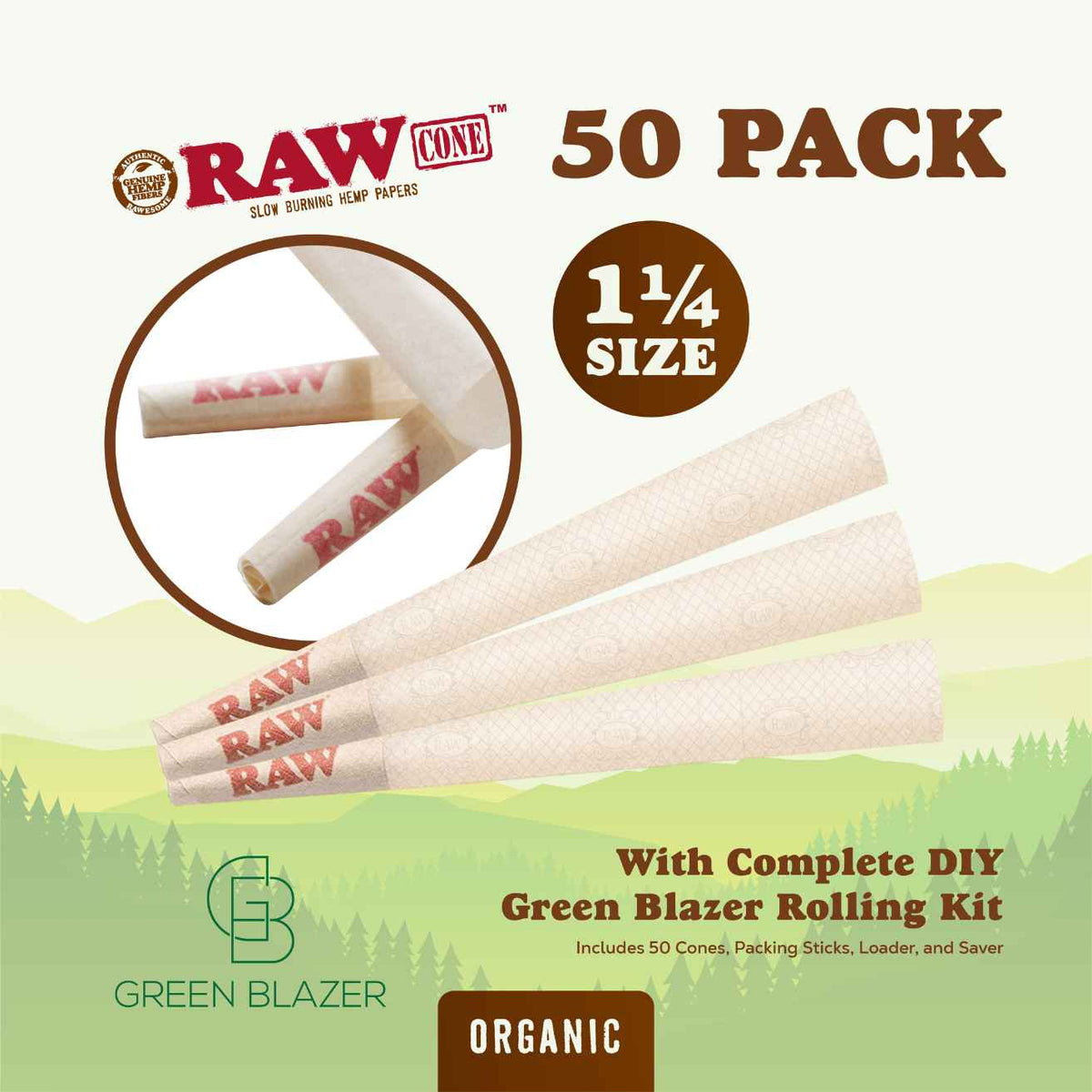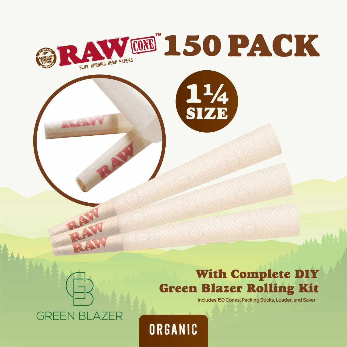 RAW Cones 1 ¼ Size Organic: Pre Rolled Rolling Papers with Filter Tips - Rawthentic, All Natural, Vegan - Includes Green Blazer Tube