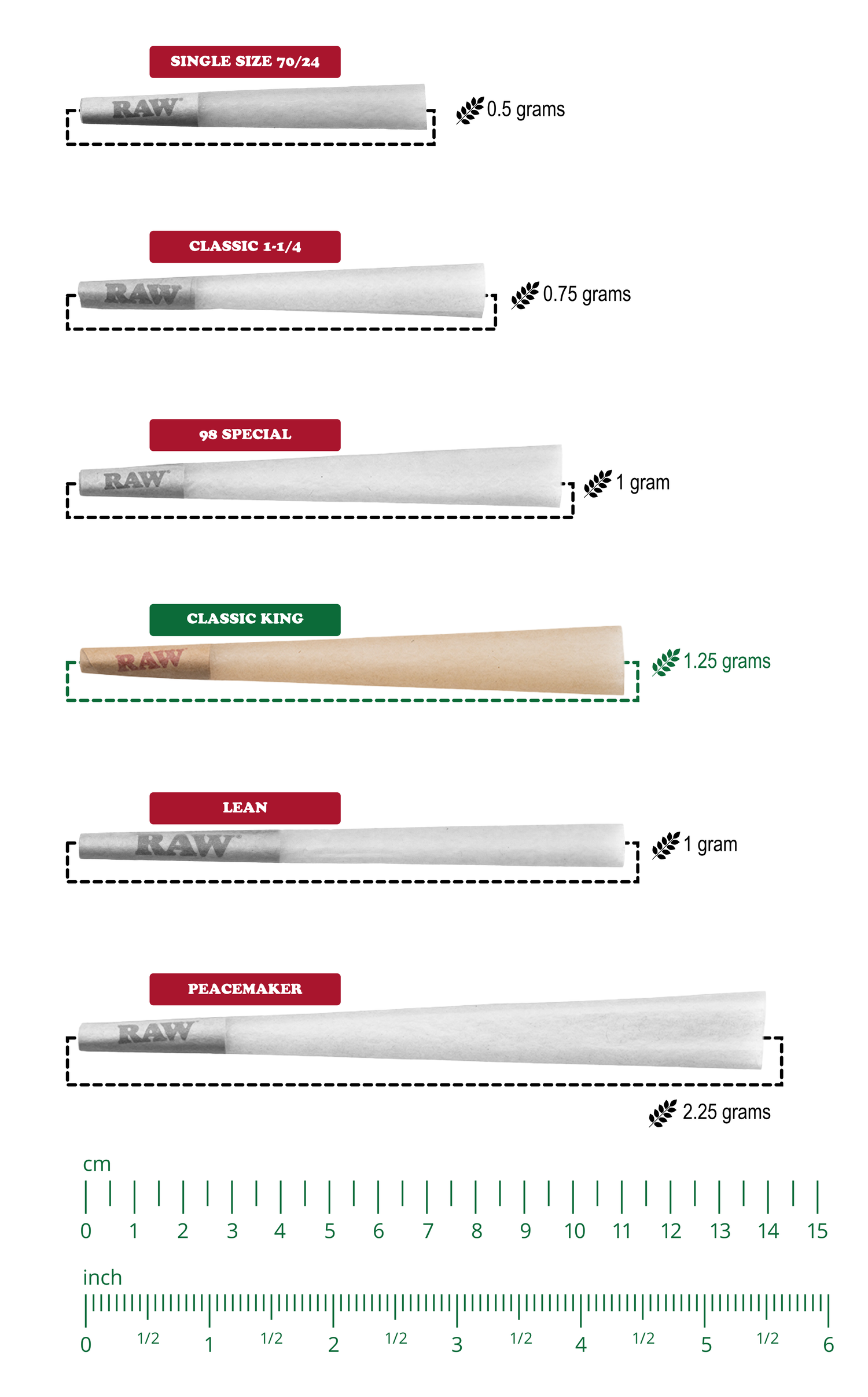 The RAW Six Shooter is precision-engineered for RAW Classic, RAW Black, and RAW Organic Hemp King Size cones, all approximately 109mm in length. These cones fit securely into the loader’s custom-milled cavities, keeping them upright for an even pack. Smaller sizes, like 1¼ cones, sit too low in the device and may not fill properly, leading to uneven results. For best performance, always use RAW King Size pre rolled cones with your Six Shooter.